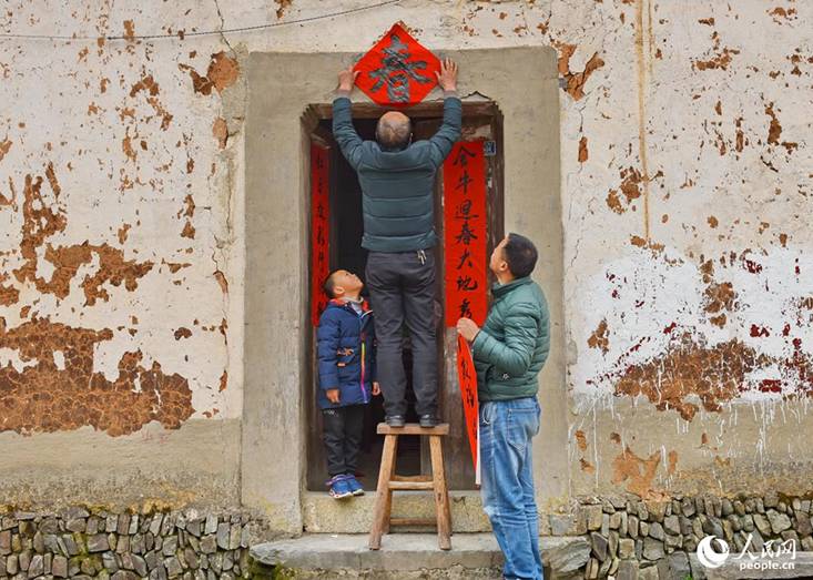 圖為貼春聯(lián)迎新年 攝影:吳靈萱 來源:人民網