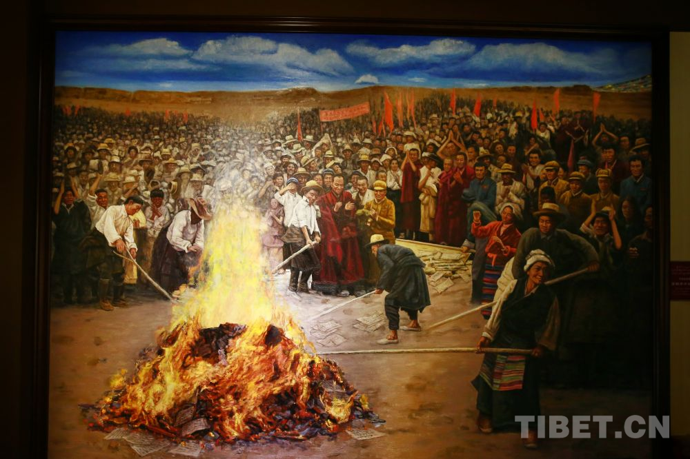 資料圖:反映達孜縣翻身農奴焚燒契約和債券文書的美術作品 翻拍:許娜