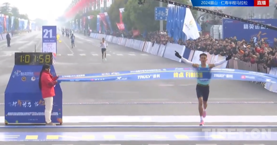 圖為2024仁壽半程馬拉來自西藏自治區運動員扎西次仁奪冠并打破全國半馬記錄