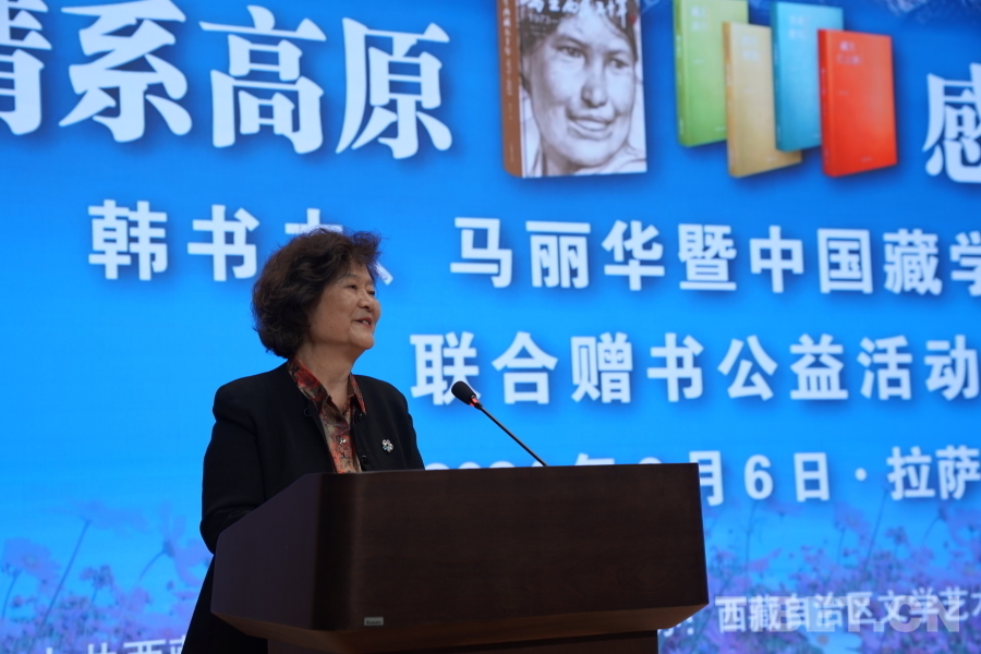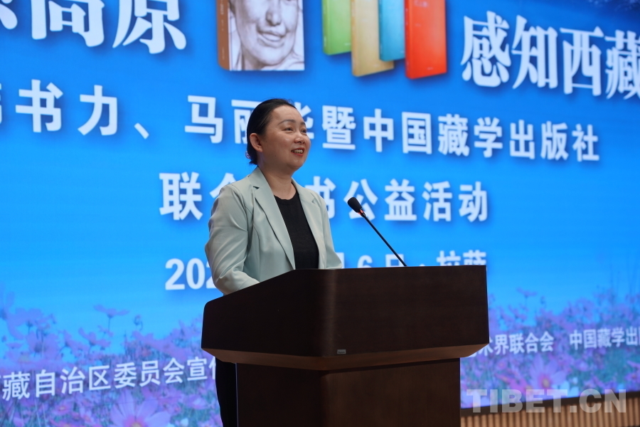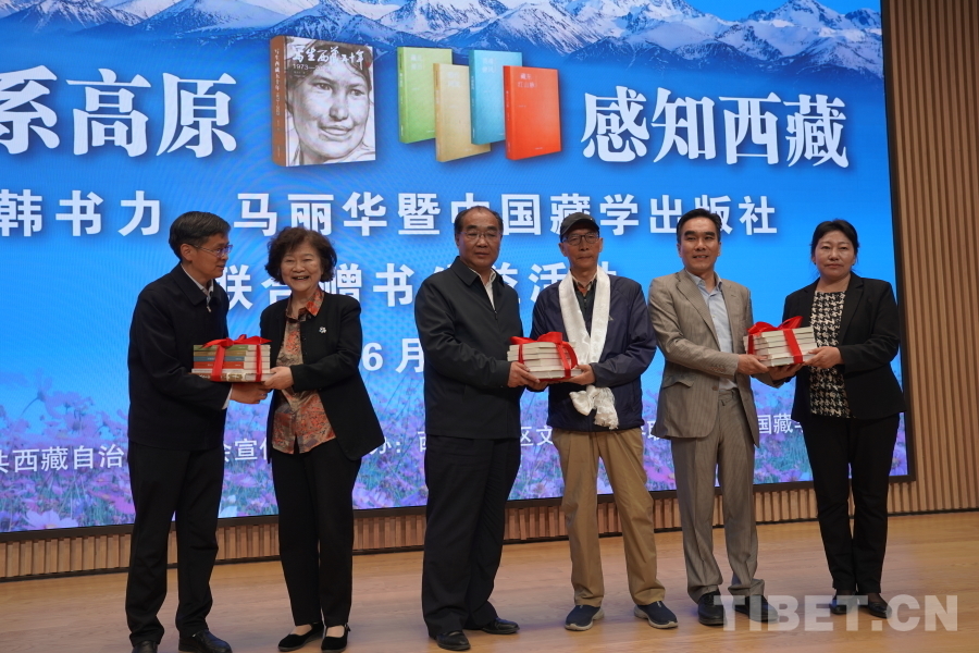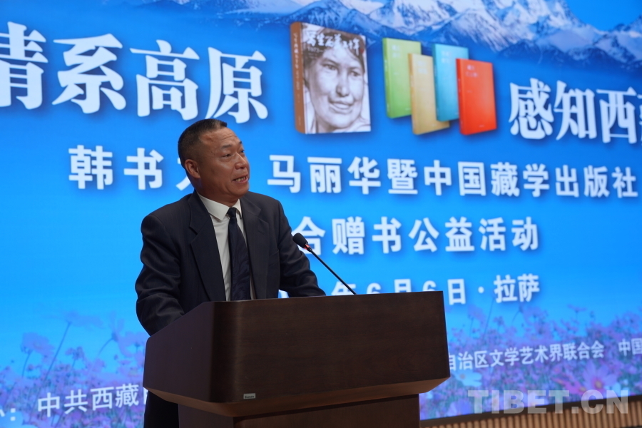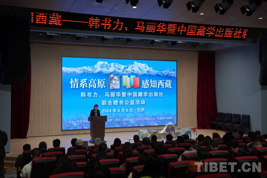 中國西藏網訊 6月6日上午,由西藏自治區黨委宣傳部主辦,自治區文聯、中國藏學出版社承辦的“情系高原 感知西藏——韓書力、馬麗華暨中國藏學出版社聯合贈書公益活動”在西藏美術館學術報告廳舉辦。自治區黨委宣傳部副部長何瑞,中國藏學出版社社長洪濤,自治區文聯黨組成員、副主席陳人杰,自治區黨委原常委、自治區政協原副主席德吉措姆,自治區文聯原主席、西藏美術家協會原主席韓書力,中國藏學出版社原總編輯、自治區文聯原副主席、西藏作家協會原副主席馬麗華等參加活動。