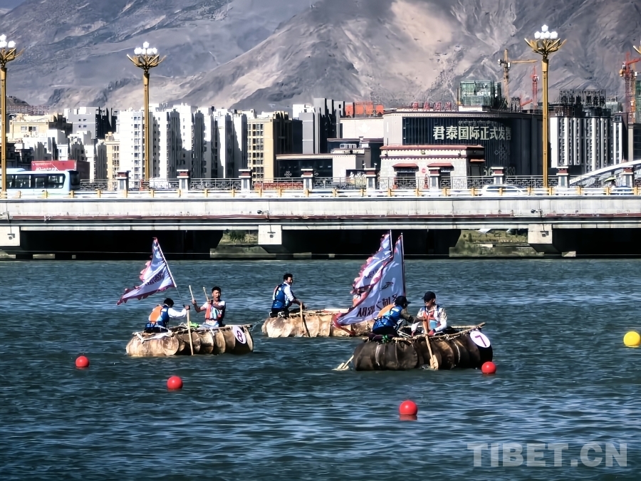 中國西藏網訊 6月9日,由西藏自治區體育局、拉薩市人民政府主辦的2024年西藏自治區端午節牛皮船(龍舟)賽在拉薩市金珠東路濱河公園水域開賽。