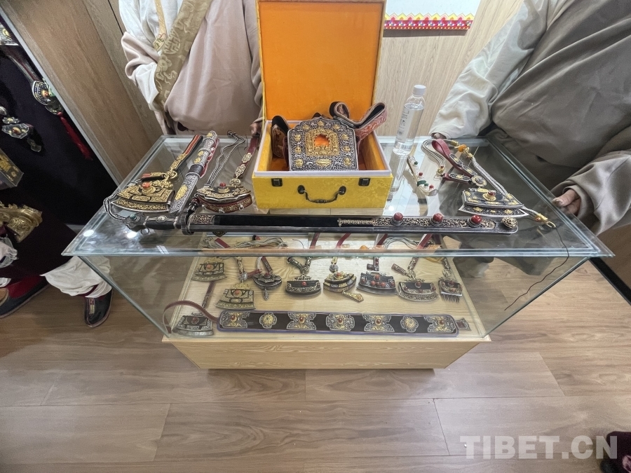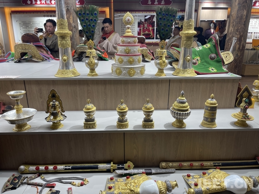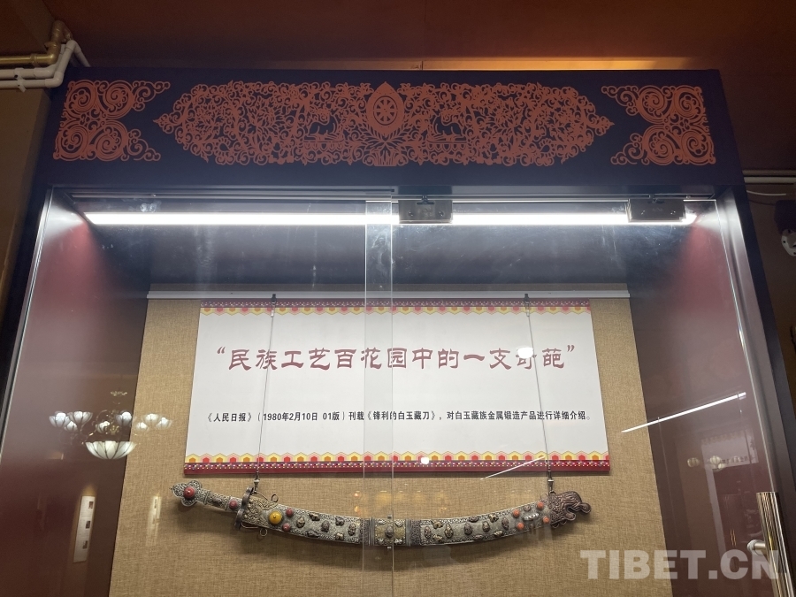 在傳習所的展廳內,各式各樣的金屬鍛造工藝品琳瑯滿目。其中,一把工藝精湛的藏刀吸引了眾人的目光。據講解員介紹,這把藏刀曾在1980年2月10日《人民日報》第一版刊載的《鋒利的白玉藏刀》上被譽為“民族工藝百花園中的一支奇葩”。白玉縣河坡鎮的金屬鍛造技藝分為七大類,刀具作為最具特色和知名度的產品,深受人們喜愛。