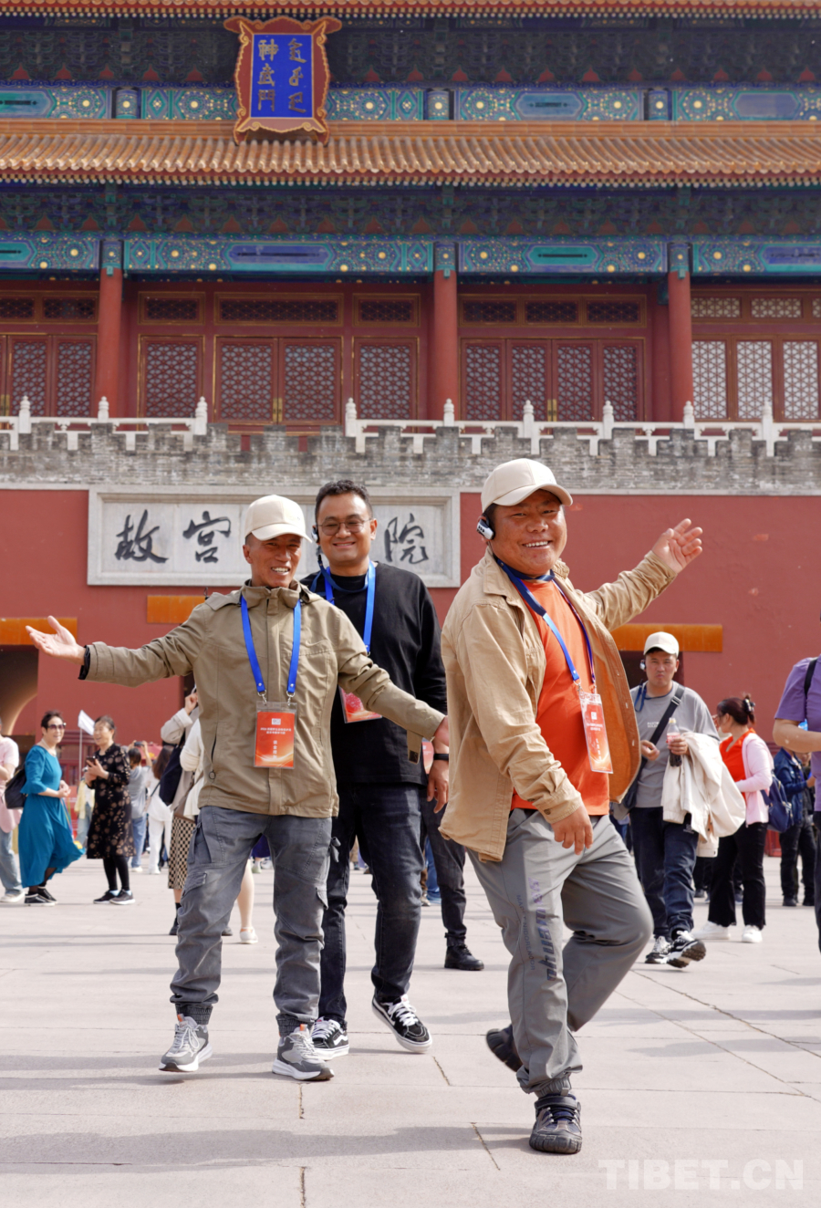 圖為羌塘國家級自然保護(hù)區(qū)尼瑪縣羅布玉杰管理站野保員扎西索朗(右一)在北京故宮博物院參觀時(shí),情不自禁地跳起鍋莊舞(王麒龍2024年4月25日攝)