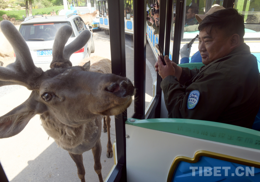 圖為西藏野保員在北京野生動物園參觀時(shí),一只梅花鹿好奇地探頭到觀光游覽車,與西藏野保員親密接觸(唐召明2024年4月24日攝)