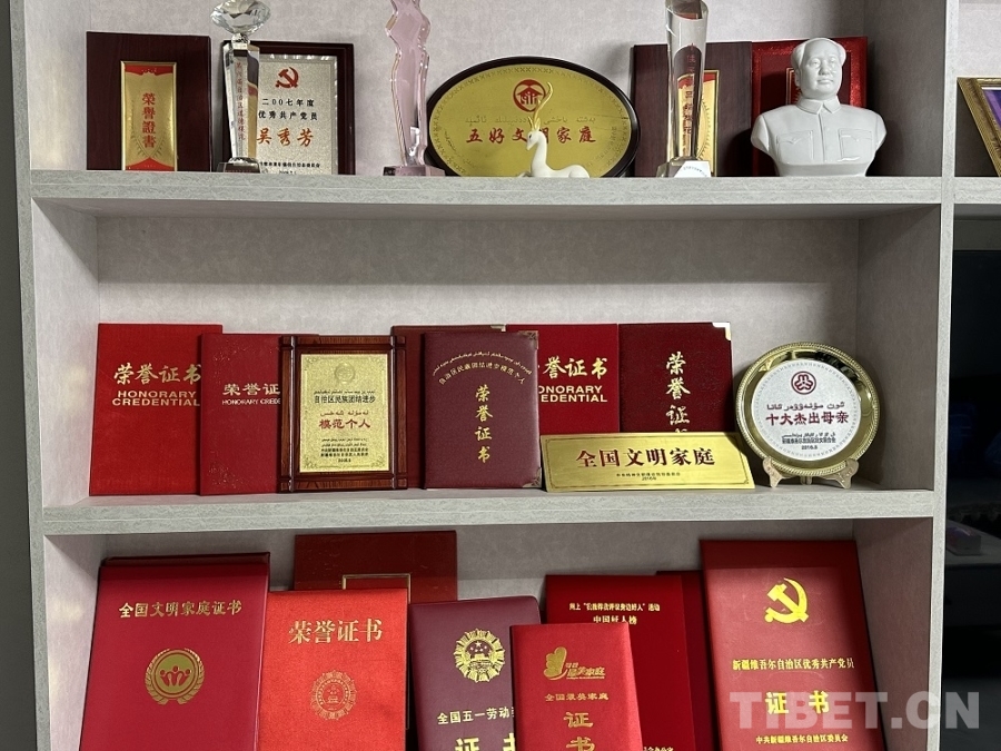 全國五一勞動獎章獲得者、全國民族團結進步模范個人,自治區民族團結進步模范個人、新疆“十大杰出母親”、全國文明家庭……記者走進吳秀芳老人家,一面碩大的榮譽墻映入眼簾,這些都是吳秀芳——這位錫伯族母親二十多年風雨歷程最好的見證。50年代出生的她,見證了新中國的成長,也經歷了個人的坎坷與挑戰。