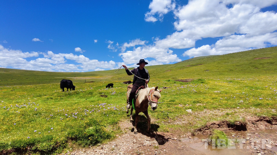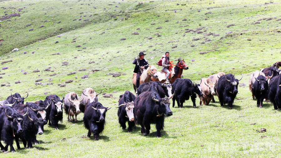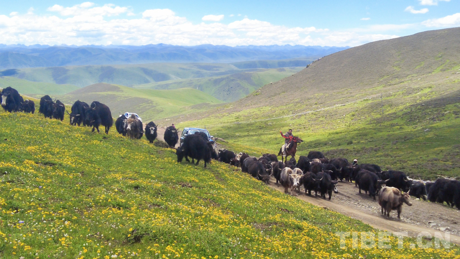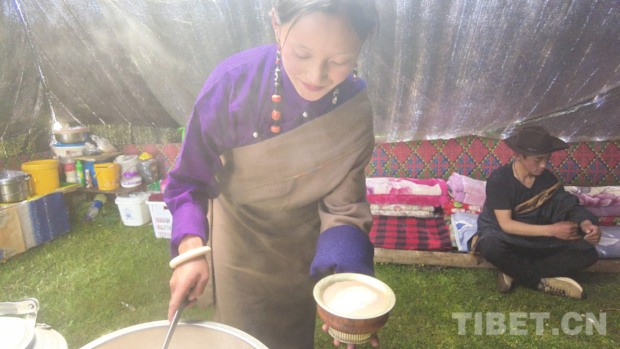 早晨天剛蒙蒙亮,他們就準備出發了,一家人把生活必需品黑帳篷,火爐,鍋碗瓢盆,被褥及酥油糌粑等物資打包裝車,由家人先駕駛拖拉機把所有物資運送到夏季遠牧點,四郎彭措則和他的侄兒騎馬趕牛出發。冬季牧場到夏季牧場距離60公里,他們經過9個小時的遷徙,終于在下午3點到達夏季牧場。此時他的家人也在鄰居的幫助下搭好了帳篷,煮好了酥油茶等待著他們。到了夏季牧場,牦牛們也迫不及待奔向了肥美的水草,四郎彭措和他的侄兒也終于可以卸下滿身的疲憊,品嘗家人們準備好的美食。夏季牧場正是一年當中最美的季節,草原上開滿了五顏六色的花朵,多日不見的好友也帶著自己的家人早一步駐扎在此地,四郎彭措說道:“夏季放牧,轉場雖然辛苦,但也是一年中難得的閑暇時光。夏季水草肥美,牦牛們有充足的食物,來到夏季牧場放牧的牧民也有更多的活動時間,賽馬、唱歌、跳鍋莊舞是我最喜歡的活動。”