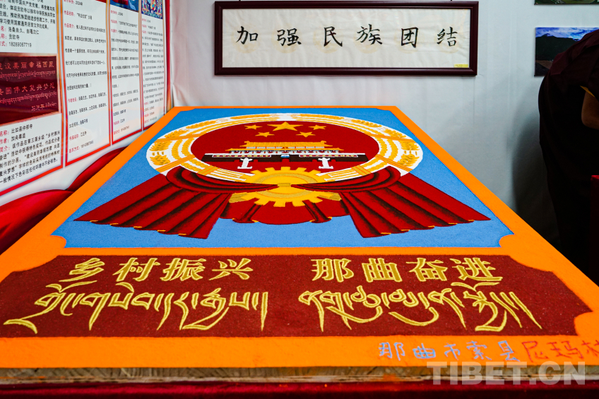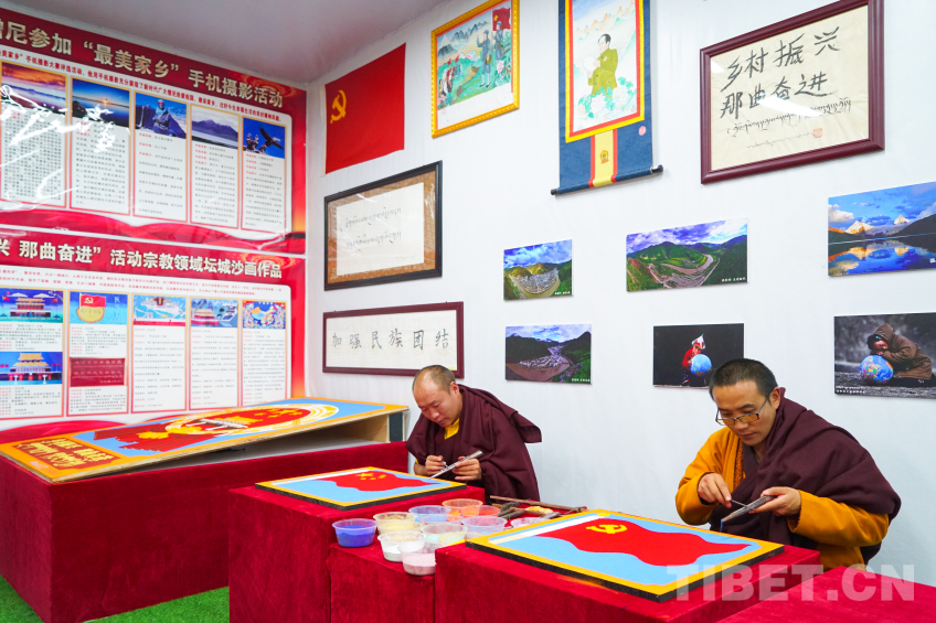 中國西藏網訊 2024年那曲恰青賽馬節暨第三屆“鄉村振興 那曲奮進”活動現場,兩位來自那曲市索縣加勤鄉尼瑪林寺的僧人用彩砂繪制工藝繪制黨徽、國旗、國徽等彩砂作品,深切表達藏傳佛教僧人愛黨愛國愛教之情,用實際行動踐行聽黨話、感黨恩、跟黨走,加深信教群眾對于祖國的熱愛。