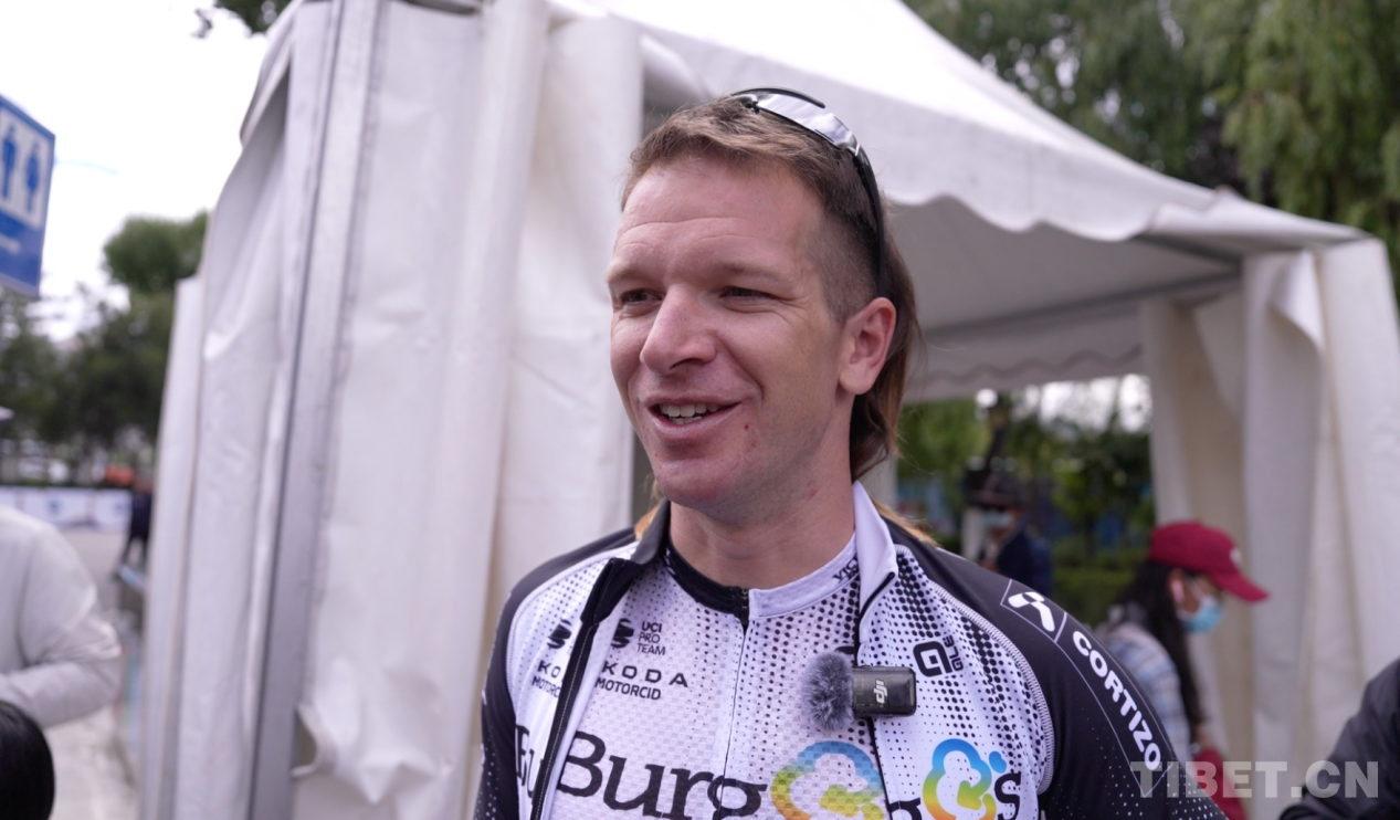 圖為拉薩繞圈賽第二名、來自布爾戈斯·BH職業(yè)隊(duì)的GATE Aaron Murray接受中國(guó)西藏網(wǎng)的采訪 攝影:德吉卓瑪