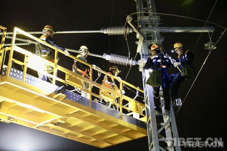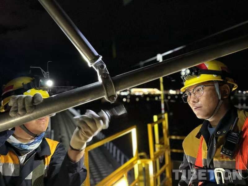 23時00分,軌道車穩穩停靠,“天窗”作業命令下達。中國鐵路青藏集團有限公司拉薩基礎設施段供電維修技術中心拉薩南接觸網維修隊工長李積王帶著7名工友走下接觸網作業車,驗電、連接地線端、接掛地線……一系列操作一氣呵成。隨即,現場負責人拉加和工友們依次登上距離地面6米高的作業平臺上,穿梭于接觸網線索之間,猶如凌空“舞者”。