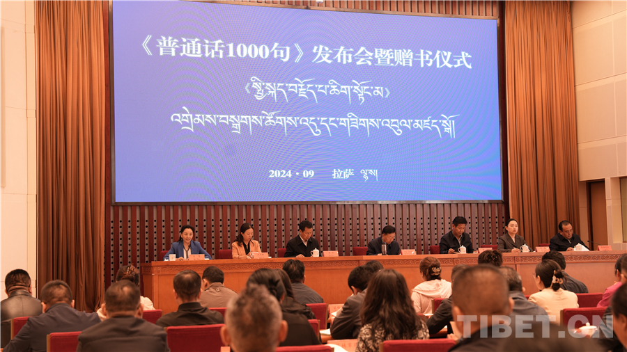 中國西藏網(wǎng)訊 為進一步助力國家通用語言文字推廣普及,鑄牢中華民族共同體意識。9月20日,西藏自治區(qū)藏語委辦(編譯局)在拉薩舉行了《普通話1000句》漢藏對照版新書發(fā)布會暨贈書儀式。西藏自治區(qū)政府副主席、自治區(qū)藏語委副主任甲熱·洛桑丹增出席會議,西藏自治區(qū)藏語委辦(編譯局)黨組副書記、主任(局長)達娃次仁作新書出版介紹,會上宣讀了教育部語文出版社發(fā)來的賀信,并向與會代表贈書。