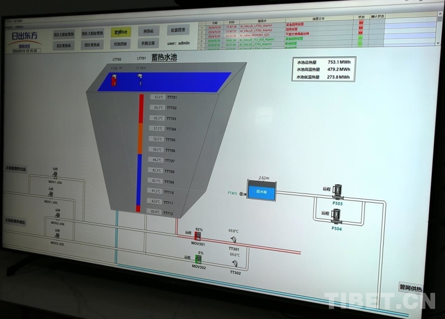 圖為運(yùn)行控制系統(tǒng)上可實(shí)時檢測蓄熱水池中各部分的水溫,平均溫度可達(dá)到60℃左右 攝影:王佳豪