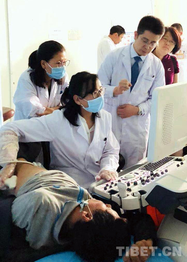 圖為夏宇(左三)援藏期間,在西藏自治區人民醫院超聲醫學科指導當地醫生做超聲檢查工作(夏宇提供圖片)