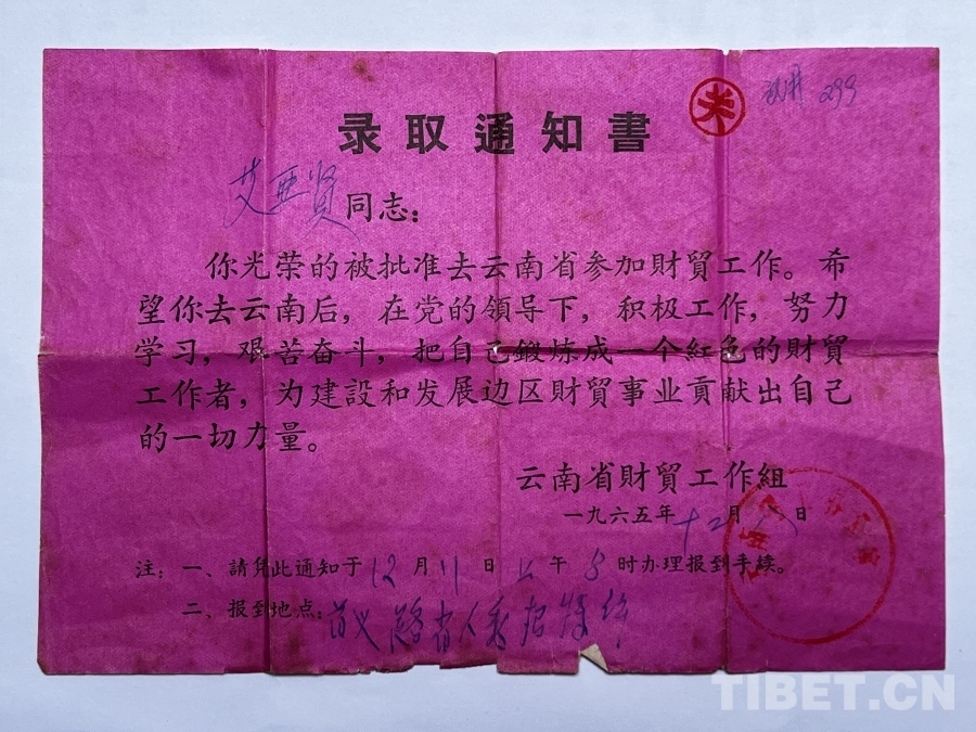 圖為1965年,云南省財貿工作組為訪談對象艾亞賢發的錄取通知書 供圖:李志農