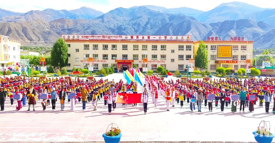 圖為西藏自治區昌都市洛隆縣俄西鄉第一小學開展升旗儀式等活動