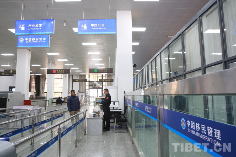 圖為12月1日,吉隆口岸聯檢大廳正式啟用新版對外開放口岸出入境邊防檢查現場標志 攝影:肖富貴