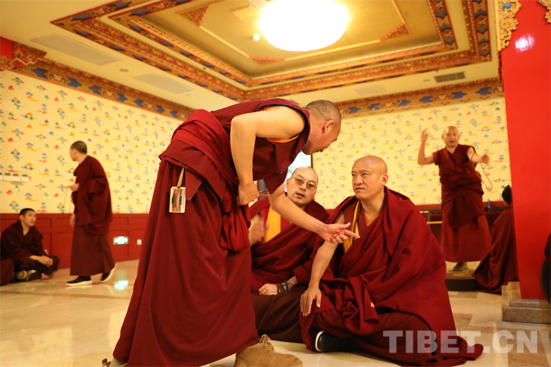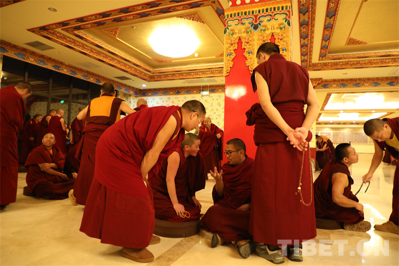 下午,師生們旁聽了中國特色社會主義理論和憲法與法律基礎等課程。晚上,開展了精彩非凡的辯經活動。學員們各自組團尋找“對手”,大廳里激烈的辯論聲、擊掌聲此起彼伏,場面熱烈,氣勢逼人。辯經是藏傳佛教中一種獨特的學習方式,通過對辯雙方邏輯清晰、言之有據的反復辯論,加深學習理解。