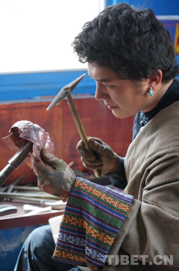 再次見到朗加時,他緩步向我走來,臉上掛著陽光般溫暖的笑容,眼神澄澈而深邃。他身著極具藏族特色的紅色繡花馬甲,這件馬甲是朗加讀小學時,母親得知朗加要在學校表演鍋莊舞,特地親手為他制作的,當時母親特意做大了些,誰也未曾想到竟一直穿到今天。十幾年過去了,繡花馬甲依舊完好如初。這也不再只是一件馬甲,更是母親的愛和溫暖,一直伴隨著朗加無數個日夜,陪伴他奔赴遠方,在傳承巴爾瑪錘揲法造像技藝的道路上走得越來越遠。(中國西藏網 文/鄒慧)