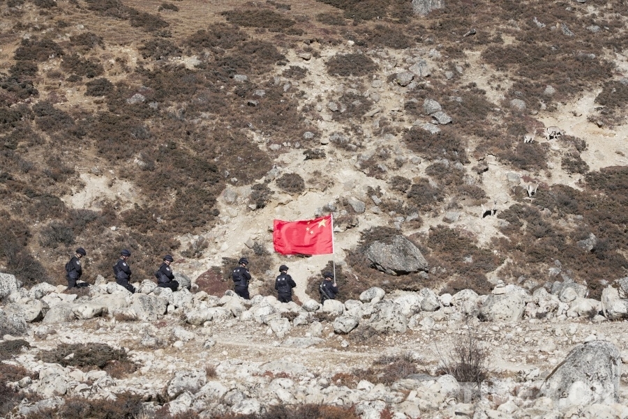 圖為色邊境派出所移民管理警察在巡邏途中與國家二級保護動物巖羊“同框” 攝影:郭遠敬