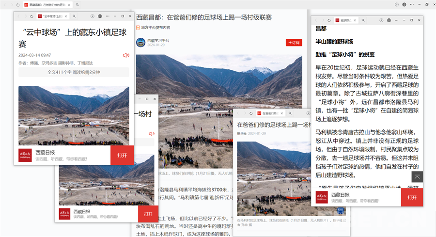 今年一月,延續七屆的馬利鎮足球“迎新杯”在“爸爸們修建的足球場”開賽的消息備受關注。一時間,《在爸爸們修建的足球場上踢一場村級聯賽》《“云中球場”上的藏東小鎮足球賽》《半山腰上的野球場 助推“足球小將”的蛻變》多篇稿件在China Daily、新華社、西藏日報、學習強國、昌都發布等平臺紛紛亮相,引起不少關注。