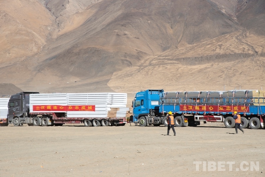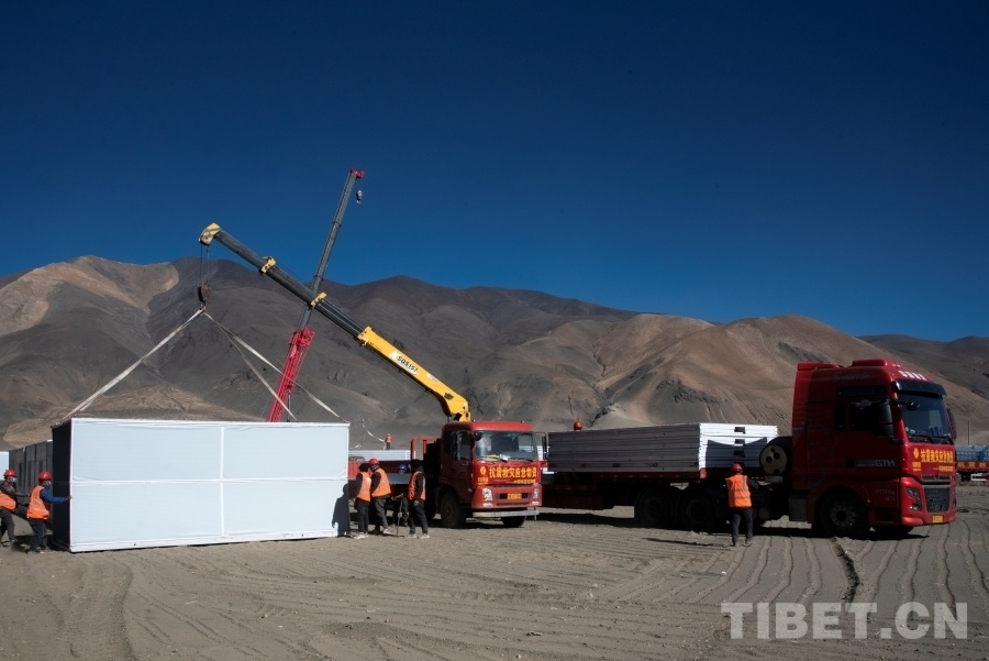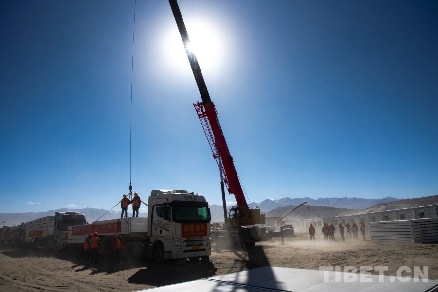 圖為工作人員正在日喀則市定日縣長所鄉(xiāng)森嘎村內(nèi)抓緊搭建活動(dòng)板房 攝影:趙振宇