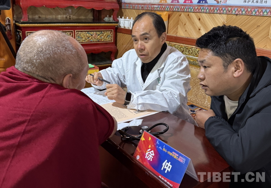 圖為醫療專家們在草登寺義診,廣州醫科大學附屬第三醫院老年醫學科主任、主任醫師徐仲正在與草登寺僧人溝通病情 攝影:喇應強