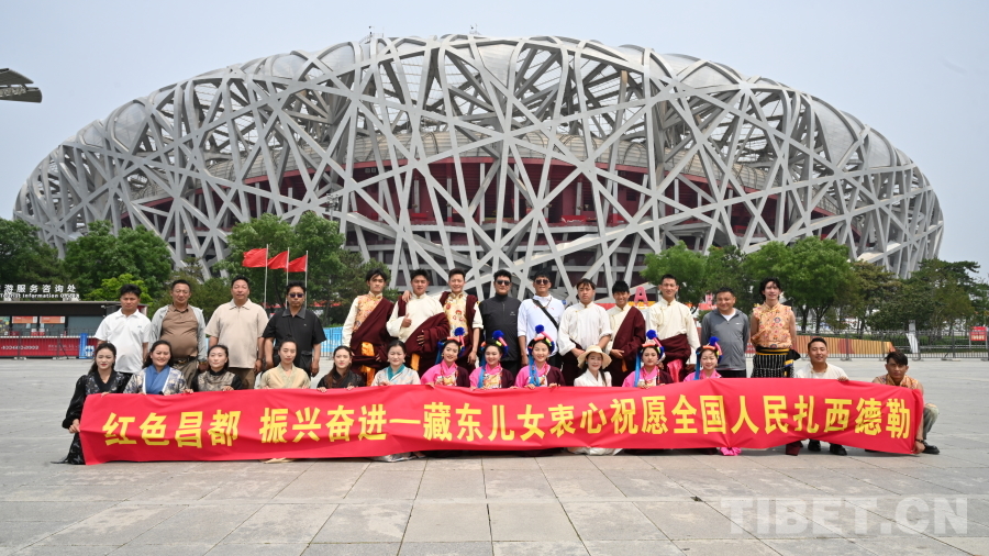 圖為西藏自治區昌都市洛隆縣文藝代表團在鳥巢前合影