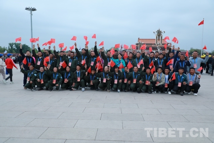 圖為2024年4月,“西藏自治區(qū)野生動物保護(hù)員進(jìn)京考察學(xué)習(xí)團(tuán)”成員觀看升旗儀式并集體合影留念 攝影:莫干措 (資料圖)