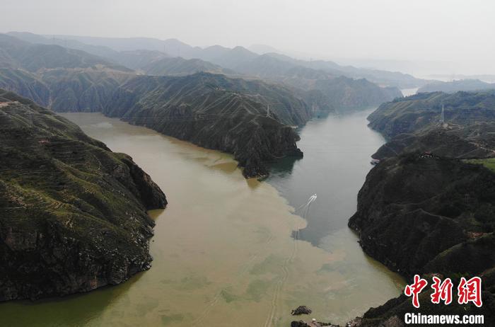 圖為甘肅永靖縣劉家峽遠眺洮河匯入黃河,入河口呈現出“二龍戲珠”的交匯奇觀。兩條河流匯聚于此,“涇渭分明”,交融卻不滲透,再加上河中石山,猶如兩條巨龍游戲于此,在當地這景象也被稱為“二龍戲珠”。(資料圖) 楊艷敏 攝