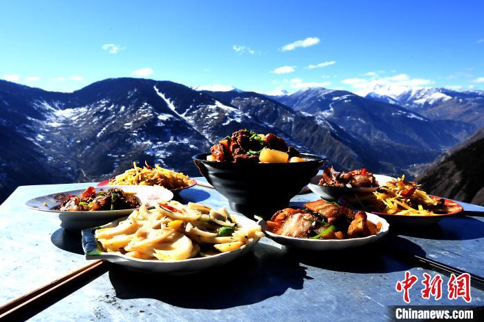 正午時(shí)分,紅燒牦牛筋、臘肉香腸、紅苕稀飯等一道道菜肴,從一間農(nóng)家小屋里新鮮出爐,端到海拔3200多米的懸崖旁的方桌上。四川省阿壩州小金縣麻足寨,天藍(lán)如洗,幽谷新雪,冬日暖陽(yáng)下,白云似觸手可及。甘家溝村扶貧第一書記張飛如常打開手機(jī),用短視頻記錄下“云端餐廳”村民用餐的場(chǎng)景。