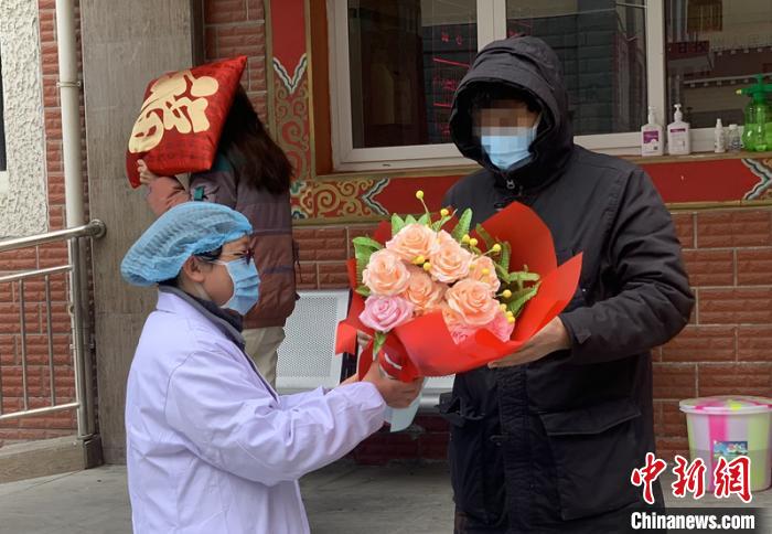 醫護人員向走出隔離病區的降某送上鮮花。 劉忠俊 攝