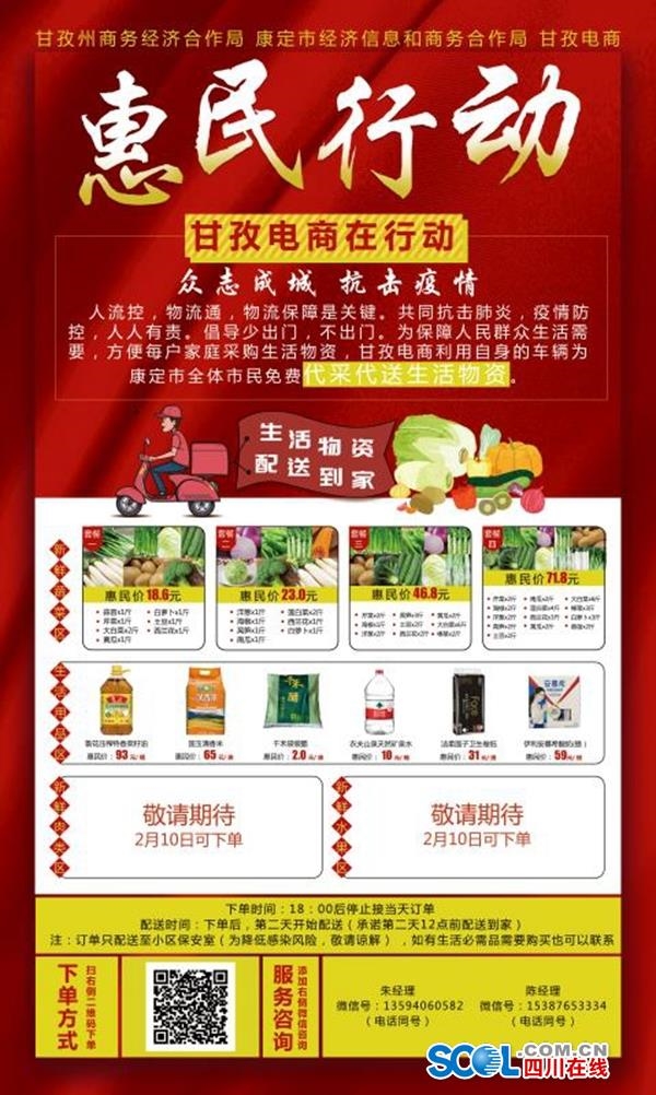 據(jù)悉,這是四川省甘孜州商務(wù)和經(jīng)濟(jì)合作局為配合防疫工作,降低市民出行交叉感染的幾率,聯(lián)合康定市經(jīng)合局、爐城和榆林2個(gè)街道辦9個(gè)社區(qū)、圣潔甘孜扶貧超市、康定民貿(mào)公司、康定鄰你超市、順豐甘孜快遞等企業(yè)和單位,為居住在康定新老城區(qū)的居民,專門開(kāi)展的“防疫套餐”送貨上門惠民行動(dòng)。