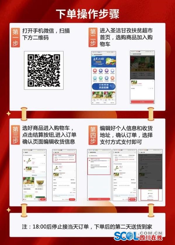 “防疫套餐”送貨上門惠民行動(dòng)從2月9日開(kāi)始試運(yùn)行,2月10日第一批蔬菜貨物正式送到家。家住在康定市新老城區(qū)的市民,只需通過(guò)掃描電子宣傳單的二維碼,進(jìn)入圣潔甘孜扶貧超市首頁(yè),選購(gòu)商品加入購(gòu)物車,點(diǎn)擊結(jié)算,進(jìn)入訂單確認(rèn)頁(yè)面編輯收貨信息,之后確認(rèn)訂單選擇支付方式支付即可。當(dāng)天下單,最遲第二天就能在家免費(fèi)收貨。