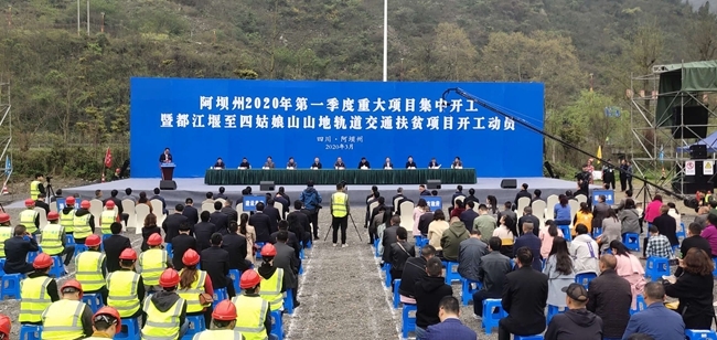 3月26日,四川省阿壩州以分會場形式在汶川縣映秀鎮遺址公園舉行該州一季度重大項目集中開工,同步舉行都江堰至四姑娘山山地軌道交通扶貧項目開工動員儀式。阿壩州委書記劉坪宣布重大項目集中開工暨都四軌道開工動員啟動。