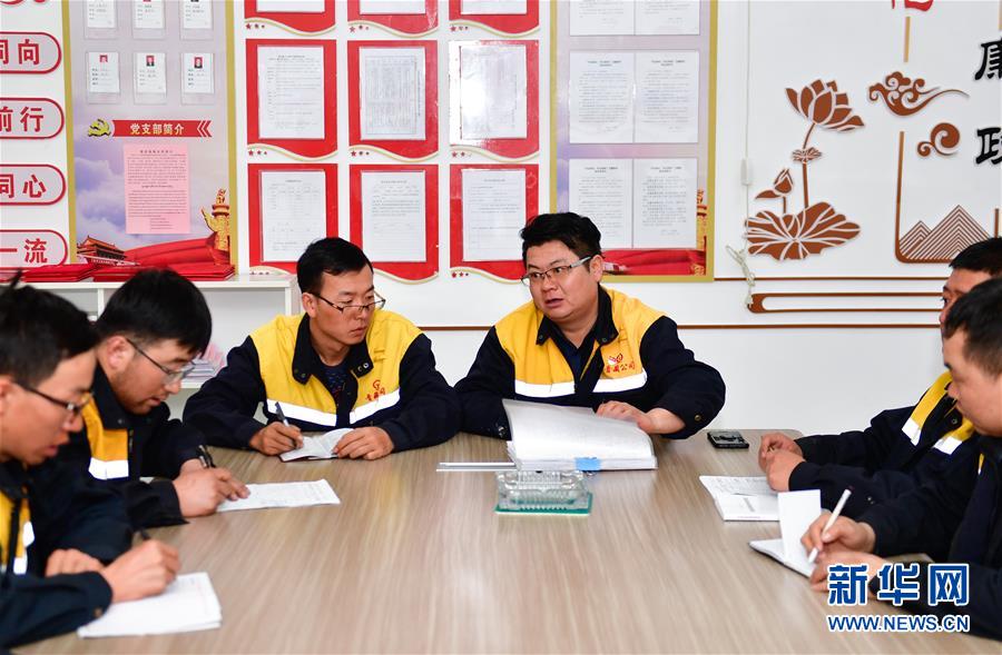1月11日,在青藏鐵路望昆站,于本蕃(右三)召集工友開會(huì)商定施工方案。新華社記者 張龍 攝
