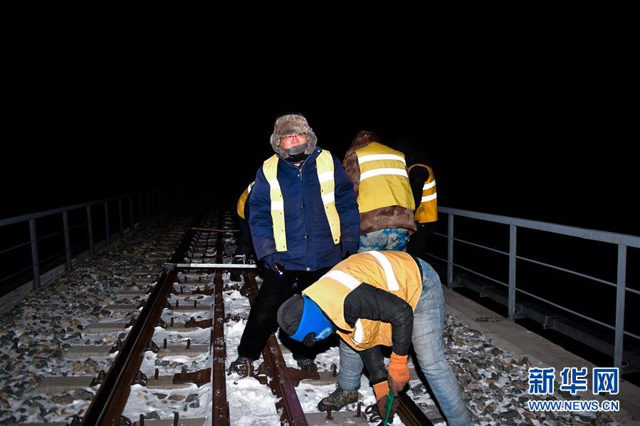 1月11日,在青藏鐵路望昆站,于本蕃檢查鐵軌。新華社記者 張龍 攝