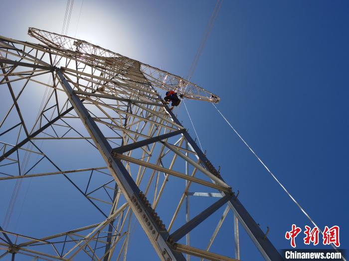 5月17日,在海拔4700多米的五道梁地區,在“電力天路”±400千伏柴拉線636號塔上,3名作業人員正在更換絕緣子串,塔下6名作業人員在全力配合,工作負責人馬興義正仰頭觀察著塔上的一舉一動,時不時提醒工作注意事項。