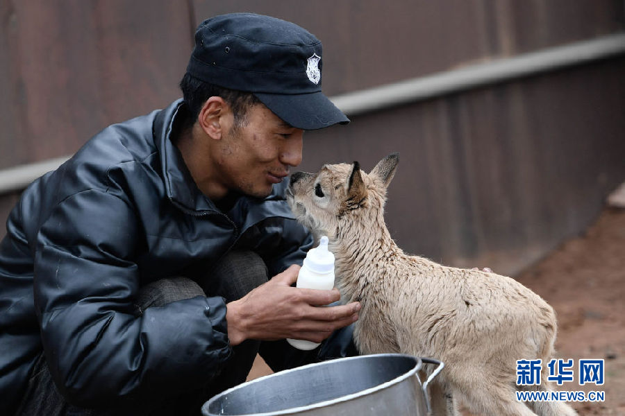 7月7日,三江源國家公園管理局長江源園區可可西里管理處卓乃湖保護站的工作人員才文多杰在給藏羚羊幼仔喂奶。新華社記者 薛玉斌 攝