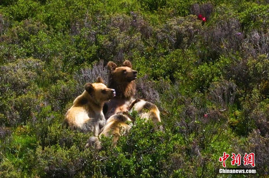 7月13日下午,記者下鄉采訪途中,在海拔4500米的四川省甘孜藏族自治州石渠縣蒙宜鎮蒙格村附近一處水草豐茂的山坡處拍攝時,偶然發現一只棕熊媽媽曬著陽光浴給三只小熊喂奶場景,棕熊媽媽喂奶結束后領著小熊寶寶們緩慢走向大山深處。