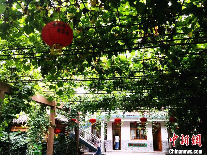 7月,中新網記者走進韓謝軍的農家樂,庭院中滿是掛滿果實的葡萄架長廊,葡萄枝葉連成片,濃密的樹蔭遮蔽了夏日炎炎。