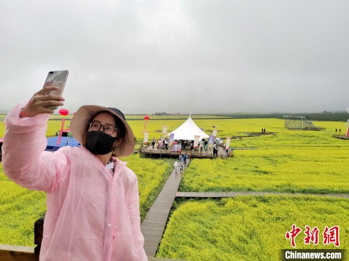 記者在油菜花海內看到,雖然當天下著雨,仍然有前來游玩的游客,當地市民趙金花說,疫情后這是他們一家人第一次來油菜花海游玩,走在一望無際的花海里心情特別輕松。
