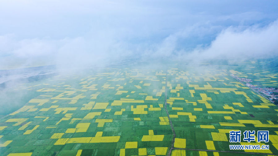 時下正值高原油菜花競相綻放的季節,在青海省海北藏族自治州門源回族自治縣,金黃色的油菜花在高原藍天和云霧映襯下形成一幅壯麗畫卷,吸引游客前來觀賞。