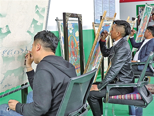 囊謙縣乃嘉瑪唐卡文化藝術(shù)有限公司里,在非遺傳承大師桑買的指導(dǎo)下,一批年輕的農(nóng)牧民唐卡繪畫藝人在成長(zhǎng),同時(shí)也拓寬了他們?cè)鍪罩赂坏那馈I昃S祖 攝