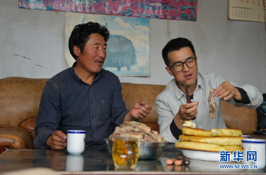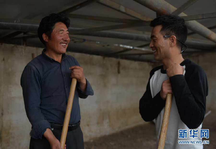 8月13日,尤拉太(左)和父親尕藏本在自家的羊圈內交談。新華社記者 張宏祥 攝