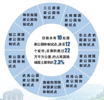 自2015年以來,我國開展了東北虎豹、祁連山、大熊貓、三江源、海南熱帶雨林、武夷山、神農架、普達措、錢江源、南山等10處國家公園體制試點。試點區將各級各類自然保護地整合劃入國家公園試點區范圍,對山水林田湖草等自然生態系統實行統一管理、整體保護和系統修復。