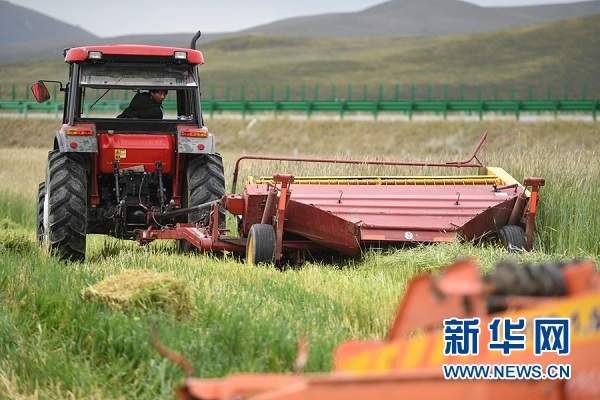 格多村村民新初駕駛打捆機進行飼草料打捆。新華網 潘彬彬 攝