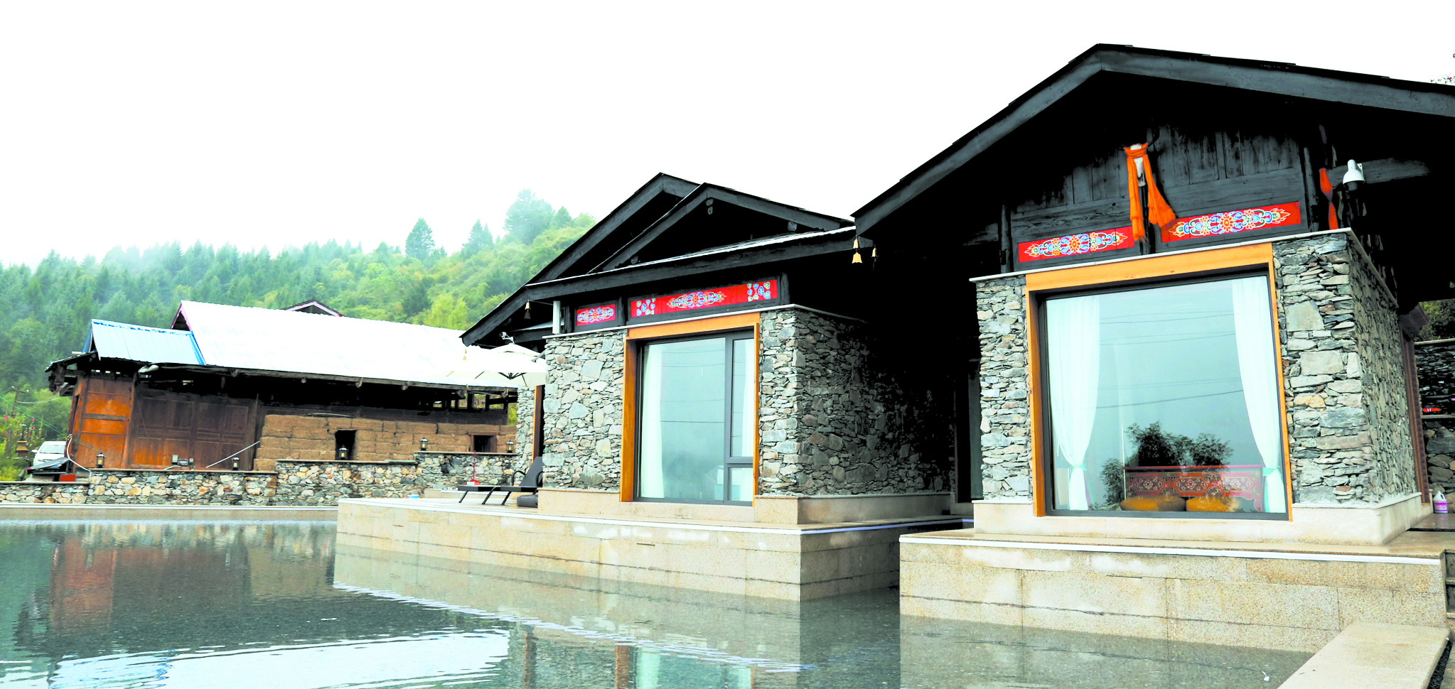 往前方望去,山勢起伏,云海翻卷,氣象萬千;往身后看,現代氣息的落地窗與石條砌墻灰瓦覆頂,結合藏式文化元素的新藏寨,在屋前環繞的水面倒映下,一個未來網紅打卡地呼之欲出。