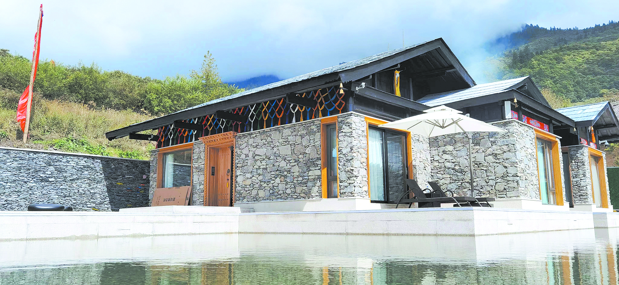 圖片的拍攝地點(diǎn)是四川省阿壩藏族羌族自治州九寨溝縣漳扎鎮(zhèn)上四寨村,圖中現(xiàn)代氣息的落地窗與毛石砌墻木瓦覆頂,藏式文化元素結(jié)合的建筑,是邛崍市第五批對口支援工作隊(duì)結(jié)合漳扎鎮(zhèn)國際魅力生態(tài)小鎮(zhèn)建設(shè),引入邛崍市資深文旅企業(yè),在九寨溝縣落地的“首秀”。