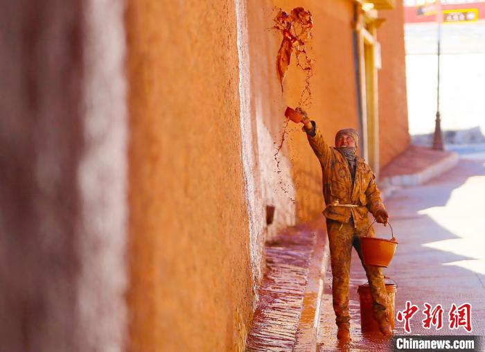 11月上旬,夏河縣拉卜楞寺內,匠人用傳統潑灑方法為寺院墻壁“美顏”?!「哒?攝