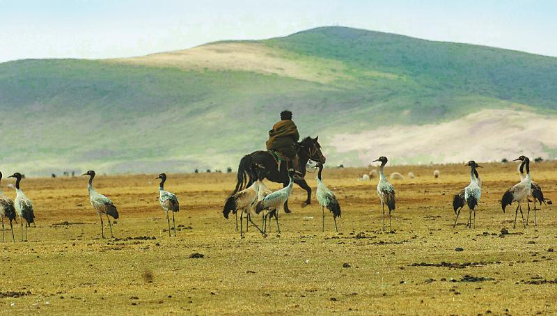 3月6日,今年的第一批黑頸鶴比往年提早了半個月飛回若爾蓋濕地,大草原上呈現出人與珍稀鳥類和諧共處的溫馨畫面。尹鋼 攝
