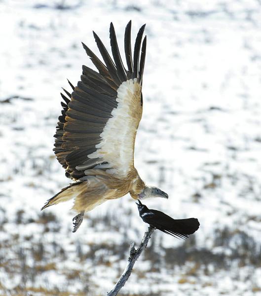 3月9日,在麥溪鄉濕地,一只草原烏鴉和一只高山兀鷲爭斗。尹鋼 攝